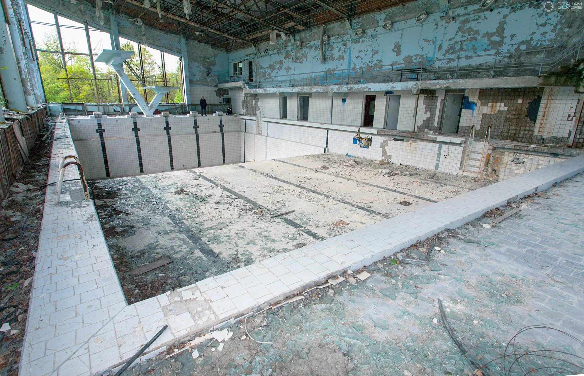 Pripyat reveals itself through its interiors. Moving through the hospital, the café, the police station, and the abandoned Azure swimming pool, the structures remain standing, but their interiors have been stripped, looted, and left to decay.